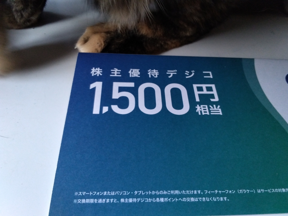 100株以上保有3年以上保有で1500円相当のデジコが6月12月の年2回戴けます🎵🎵